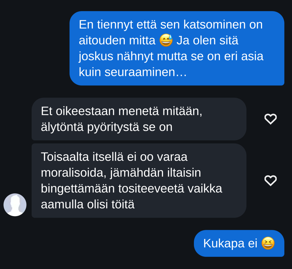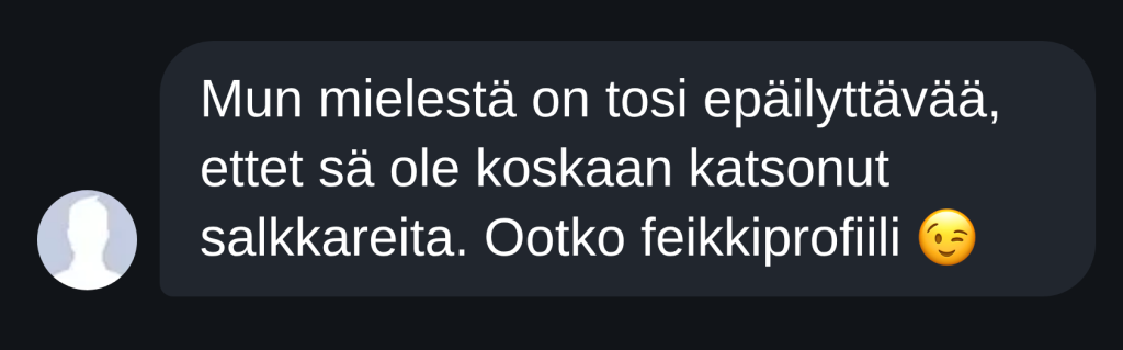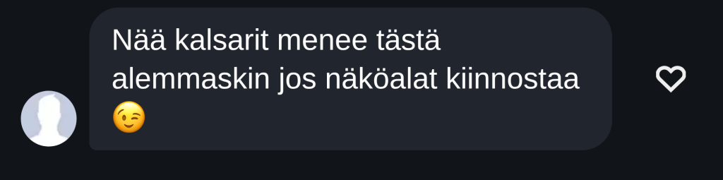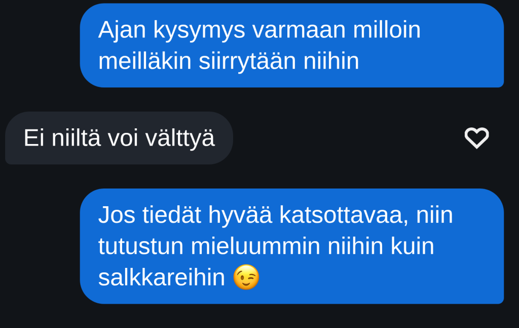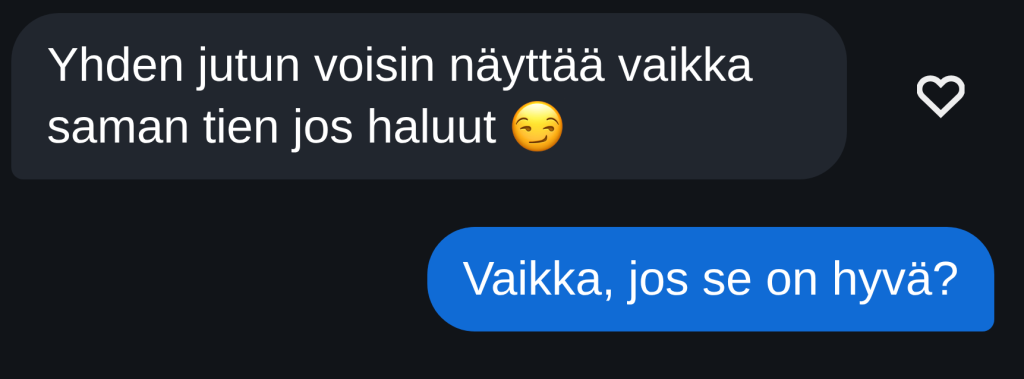 Saattoi tietysti olla sellaisiakin naisia, joita itsensäpaljastelu juuri ja juuri Suomen lain sallimissa rajoissa kiihotti, mutta Pia ei kuulunut tähän valikoituun joukkoon. Hän veti huulensa tiukaksi viivaksi ja poisti koko keskustelun vastaamatta mitään viimeiseen viestiin. Aika varmaan poistaa koko roskasovellus puhelimesta. Tämä tapaus oli jälleen todiste siitä, että todellisten helmien tonkiminen deittisovelluksen pohjamudista ei voi olla kaiken vaivan arvoista. Paljon tyydyttävämpään lopputulokseen päätyisi varmasti selaamalla suristinkauppojen verkkosivuja, ja kalliskin lelu kävisi halvemmaksi kuin huonoilla treffeillä ravaaminen.