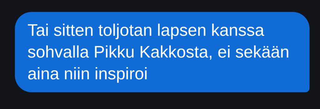 Pia oli niin keskittynyt puhelimeensa, ettei muistanut käydä närpyttämässä Elisalle vartti sitten loppuneesta ruutuajasta. Lapsi olisi saattanut reiluuden nimissä vaatia myös Piaa laittamaan puhelimen pois, eikä nyt ollut aikaa keksiä tekopyhiä selityksiä oman kännykänkäytön tärkeydelle.